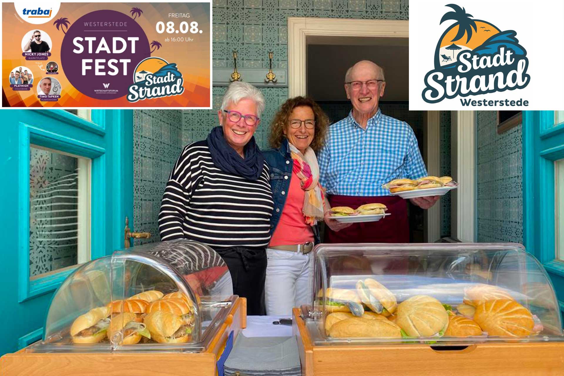 Am 8. August feiert Westerstede Stadtfest – und am Hoteleingang vom Hotel Busch, direkt am Marktplatz und dem diesjährigen Stadtstrand – gibt es frische leckere Fischbrötchen. Wir verkaufen hier mit fröhlicher Stimmung, fast wie auf einem Fischmarkt, frisch zubereitete Fischbrötchen mit zum Beispiel Matjes und Bismarkhering. Da läuft jedem Fisch- und Nordseeliebhaber das Wasser im Mund zusammen. Danach ein Erfrischungsgetränk im Biergarten vom Hotel Altes Stadthaus – direkt gegenüber. Wie immer sind unsere beiden historischen Gasthäuser am Markt in Westerstede voll involviert und motiviert am Stadtfest dabei. Besuchen Sie uns, genießen sie die tolle Stadtfest-Atmosphäre. Das Wetter soll gut und warm werden, was für Familie, Freunde und alle Gäste eine zusätzliche Freude und Motivation ist, uns in Westerstede zu besuchen. Und ganz nebenbei bemerkt: der Westersteder Stadtstrand lädt bis zum 21. September auf unserem Marktplatz zum Verweilen ein. Und unsere Fischbrötchen gibt es weiterhin im Restaurant vom Hotel Altes Stadthaus zu kaufen. Kommen Sie – und genießen Sie den Sommer mit Fischbrötchen und froher Stimmung!